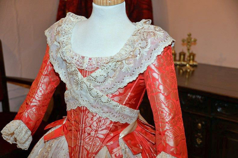 El traje tiene un dibujo de damascos y está tejido en fondo de seda rojo tramado en color champagne.
