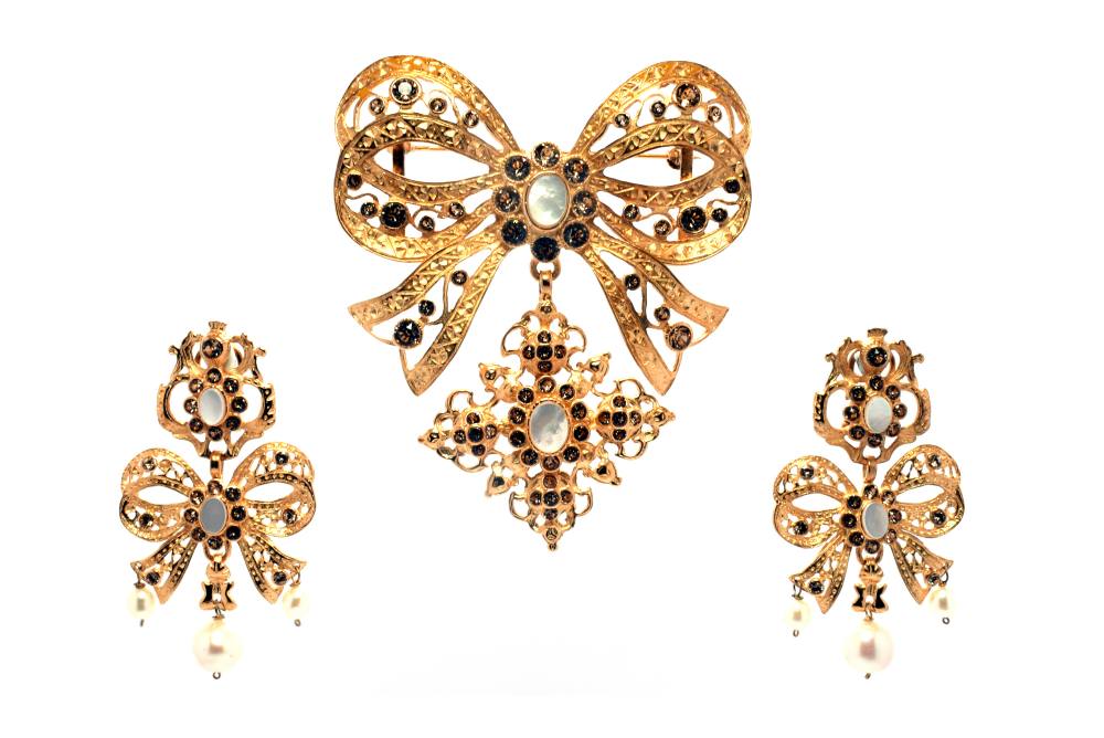 Conjunto compuesto por joia, pendientes, cuatro pinchos para moño y cuatro horquillas para los rodetes.