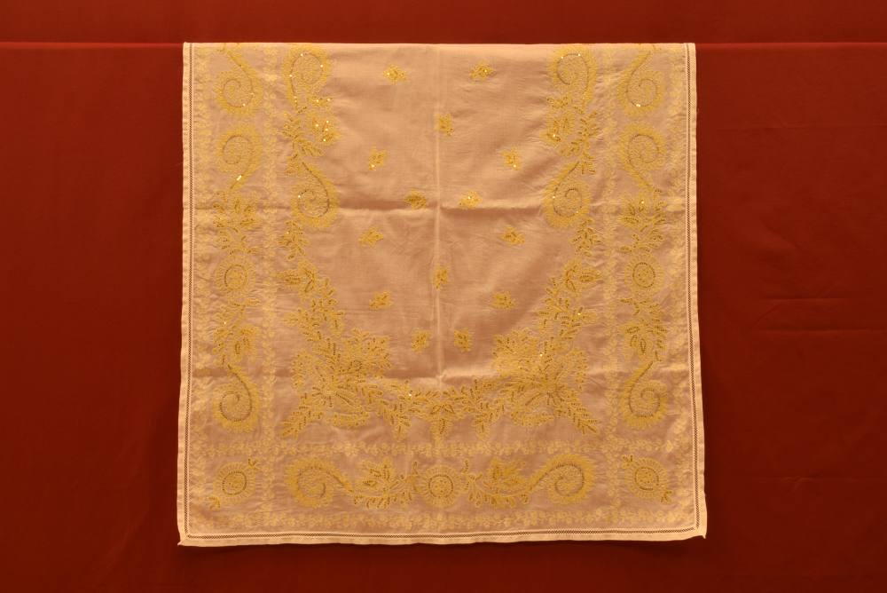 Juego de manteleta y delantal con dibujo Caregols, bordado con hilo Oro sobre tejido Batista algodón y con lentejuelas en Oro.