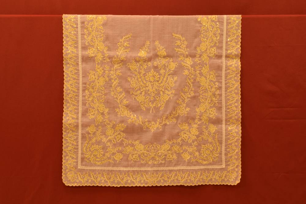Juego de manteleta y delantal con dibujo Coronita, bordado con hilo Oro sobre tejido Batista fina y con lentejuelas en Oro.