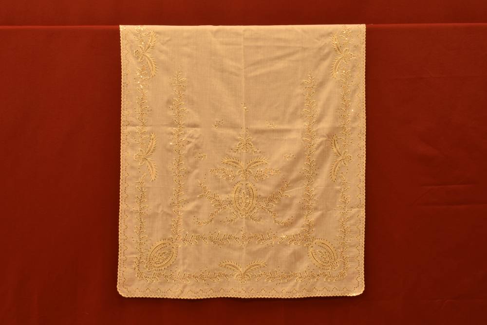 Juego de manteleta y delantal con dibujo Palmera, bordado con hilo Beige sobre tejido Batista y con lentejuelas en Oro.